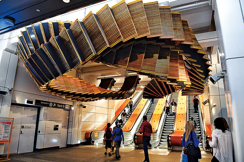 Construită din lemn recuperat din scări rulante originale din 1931, sculptura este menită să evoce fluxul de persoane, care este similar cu fluxul natural de apă.
