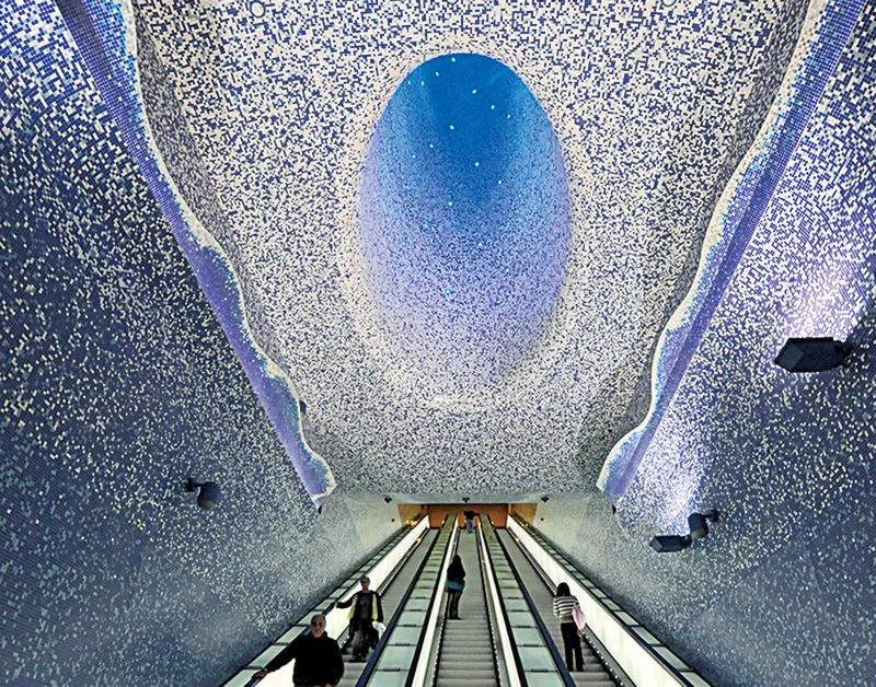 Plăcile de mozaic minuscule, albastre și albe, din această stație napolitană sunt destinate să reproducă apa și lumina, aducând o senzație de natural în subteranul industrial al celei mai adânci stații din oraș.