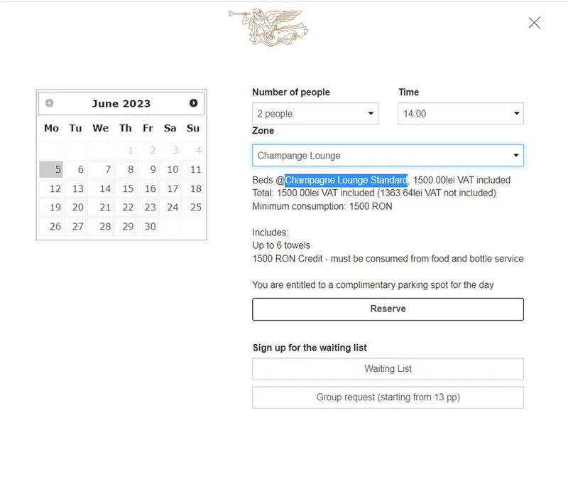- închiriere „Champagne Lounge Standard”: 1.500 lei, capacitate până la 6 persoane (tariful reprezintă consumația minimă)