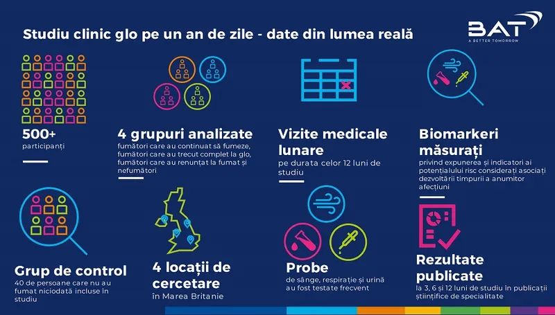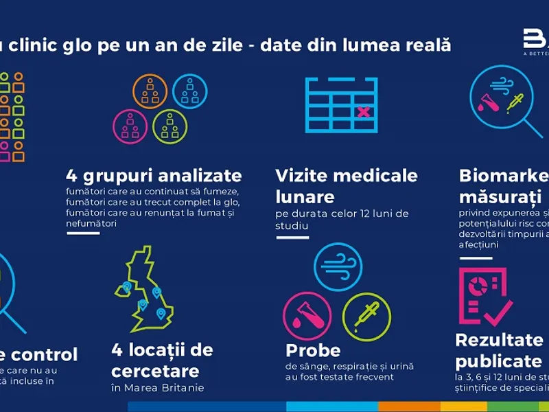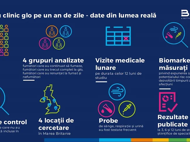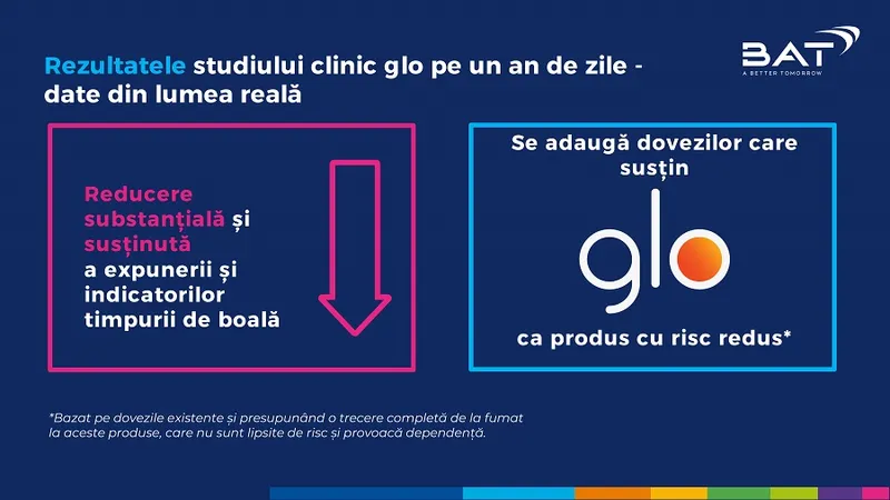 Rezultatele complete ale unui studiu efectuat pe durata unui an de zile arată că fumătorii care au trecut exclusiv la glo, cel mai inovator produs din portofoliul BAT care încălzește, nu arde tutunul, au obținut îmbunătățiri semnificative și susținute în privința mai multor indicatori de potențial de risc asociat dezvoltării timpurii a unor afecțiuni (între care boli pulmonare, cancer și boli cardiovasculare), în comparație cu cei care au continuat să fumeze.
