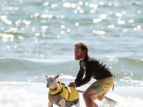 În timp ce copiii şi adulţii entuziasmaţi vâslesc frenetic pe plăcile de surfing peste valurile înspumate ale Pacificului până pe plajă, un pasager participă placid la această distracţie: o capră mare şi albă.