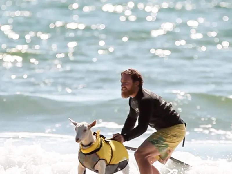 Surferul din California Dana McGregor a iubit întotdeauna fiorul de a prinde un val, dar abia după ce într-o zi şi-a luat cu el la surfing animalul de companie, o capră, şi-a găsit cu adevărat chemarea.