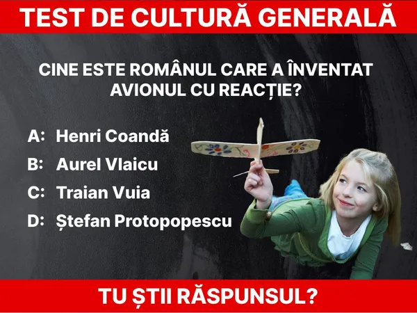 Azi avem un test de cultură generală pe care și copiii din clasele primare știu să-l rezolve. Cine este românul care a invetat avionul cu reacție? sigur ai răspunsul corect.