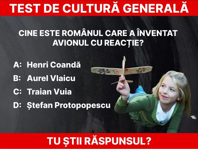 Testul de cultură generală de azi este din istoria aviației. Cine este românul care a inventat avionul cu reacție? Nu se poate să greșești acest răspuns pentru că și copii de clasele primare îl știu.
