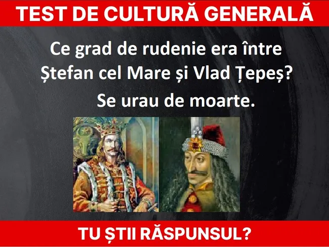 Testul de cultură de azi este despre doi mari domnitori.:Vlad Țepeș și Ștefan cel Mare. Ei erau rude însă se dușmăneau de moarte, spun istoricii.