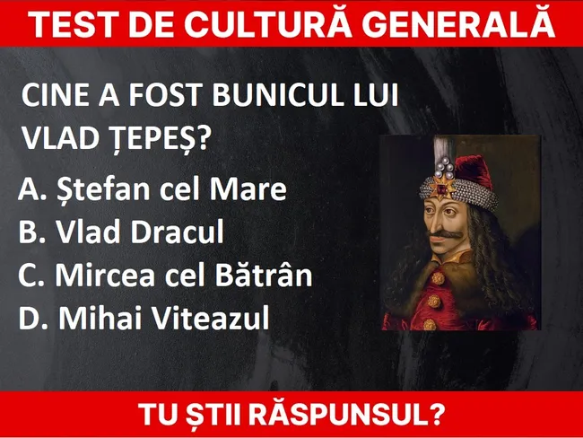 Testul de cultură generală de azi este despre domnitorul Vlad Țepeș. Cel mai probabil nu există om pe planetă care să nu fi auzit vreodată în viață numele lui. Iar acest lucru de datorează unui film numit ”Contele Dracula”. Bunicul său a fost un domnitor iubit de popor.