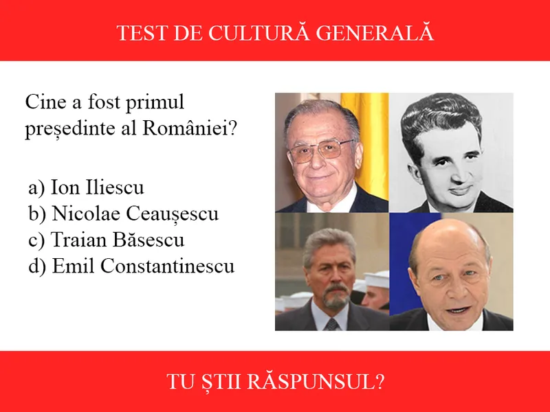 Întrebarea de cultură generală de astăzi se referă la primul președinte al României. Tu știi cine a fost acesta? Testează-ți cunoștințele și răspunde la întrebare!