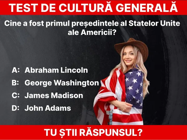 Testul de cultură generală pe care vi-l propunem azi este din istoria Statelor Unite ale Americii. ”Cine a fost primul președinte al SUA?” sigur ai răspunsul. Viața lui a fost subiectul unui film apărut în 2000, scris și regizat de David Gordon Green. Un oraș îi poartă numele.