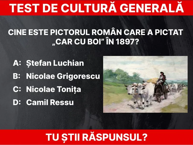 Testul de cultură generală de azi este despre pictură. Cine este pictorul român care a pictat ”Carul cu boi” în 1897? Este unul dintre cele mai ușoare teste de până acum.