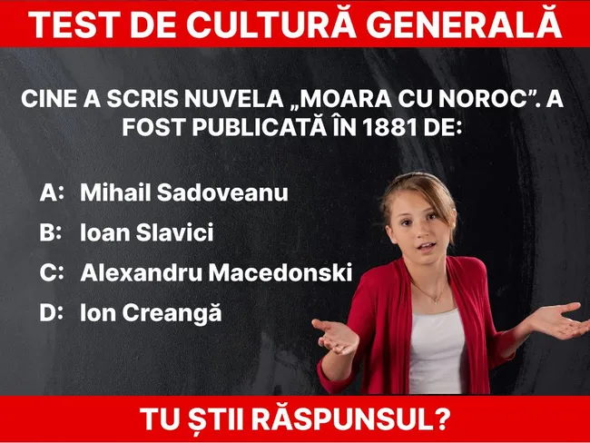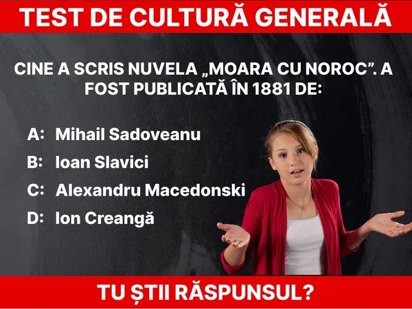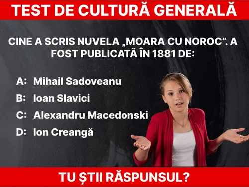 Testul de cultură generală de azi este din domeniul Literaturii române. Răspunsul la întrebarea: cine a scris nuvela ”Moara cu noroc” este mult prea simplu pentru a face parte dintr-un test.