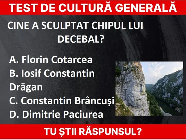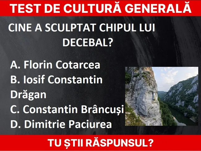Testul de cultură generală de azi combină istoria, geografia și arta. Cel mai probabil nu există român să nu fi trecut vreodată pe lângă statuia lui Decebal, sculptată în stâncă, în apropiere de Orșova. Este cea mai mare din Europa și una dintre cele mai mari din lume.