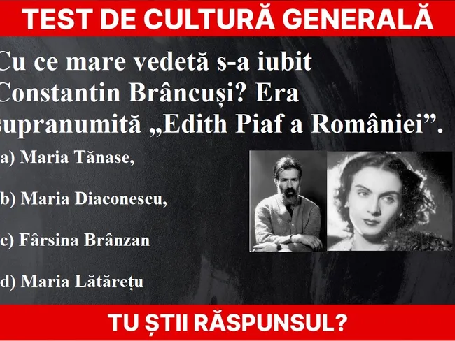 Testul de cultură generală de azi este despre viața lui Constantin Brâncuși. În ultimii ani ai vieții sale, celebrul sculptor român făcuse o pasiune pentru o divă din România. Era cu 37 de ani mai tânără ca el și l-a iubit nespus. S-au despărțit și ea a suferit.
