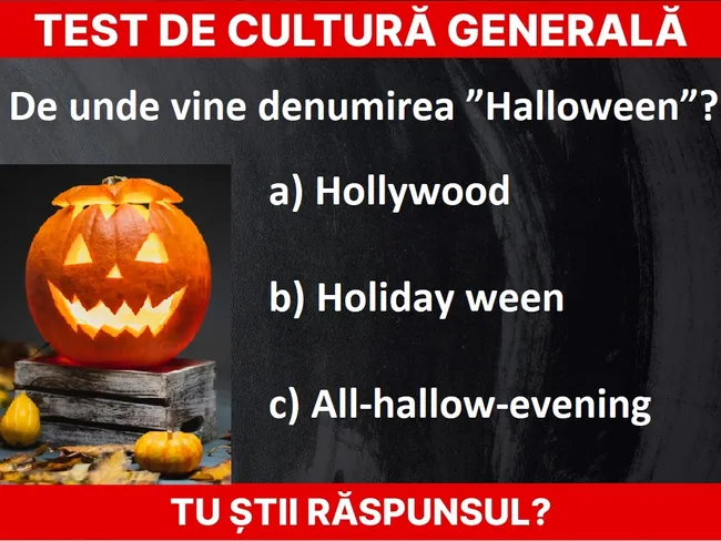 Testul de cultură generală de azi este despre Halloween, sărbătoarea de pe 31 octombrie cunoscută pentru costumele de groază pe care le poartă copiii la colindat și pentru dovlecii transformați în lanterne. Puțini știu însă ce înseamnă numele acesteia.