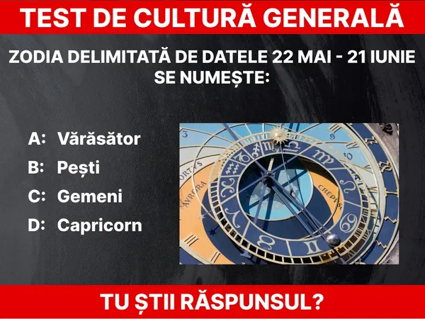 Testul de cultură generală de azi este despre horoscop. Ce zodie este delimitată de datele 22 mai - 21 iunie?. Cei care sunt născuți în această perioadă sigur au răspunsul.