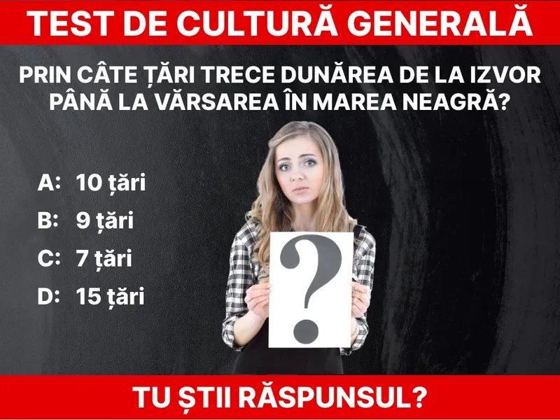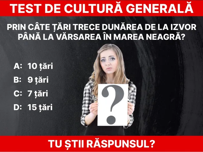 Azi vă propunem un test de cultură generală din Geografie. Prin câte țări trece Dunărea? Răspunsul trebuie să îl știe toată lumea. Fluviul ne leagă de Serbia, Bulgaria, Republica Moldova și Ucraina.