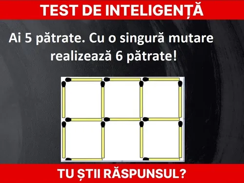 Test de inteligență. Avem 5 pătrate din bețe de chibrit. Cu o singură mutare poți găsi 6. Vezi cum?