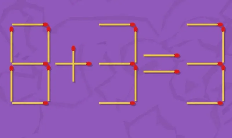 Avem ecuația 8+3=3 din bețe de chibrit. Se vede că este greșită. Astfel că trebuie să mutați un bețișor pentru a găsi forma corectă.
