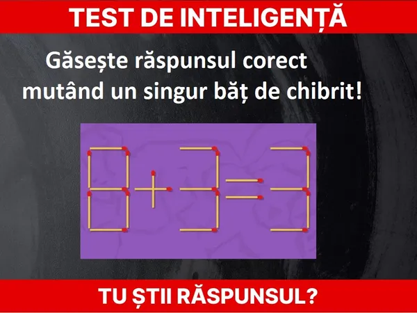 Citește și: Test de inteligență. Avem ecuația 9 + 3 x 2 =2 din bețe de chibrit. Mută unul și află forma corectă