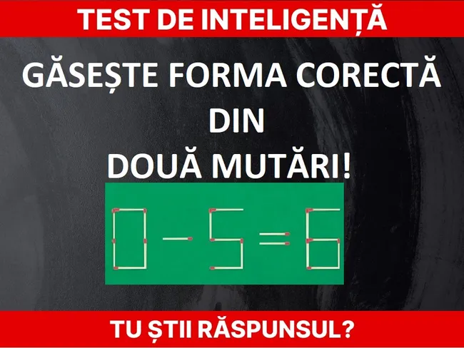 Acest exercițiu îți poate testa abilitatea de rezolvare a problemelor. Trebuie să găsiți forma corectă a ecuației făcând doar două mutări. Provocarea nu este foarte ușoară iar cei care reușesc în timp scurt dau dovadă de o inteligență peste medie.