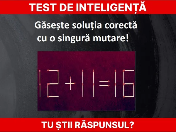 Test de inteligență. Avem ecuația 12+11=16 din bețe de chibrit. Găsește forma corectă dintr-o mutare