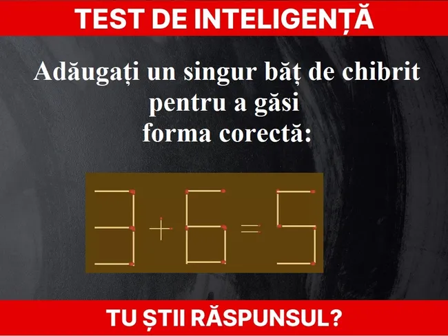 Vă propunem o provocare cu bețe de chibrit. Cu un singur băț adăugat putem afla ecuația corectă. Tu îți dai seama ce trebuie să faci? Rezolvă totul rapid.