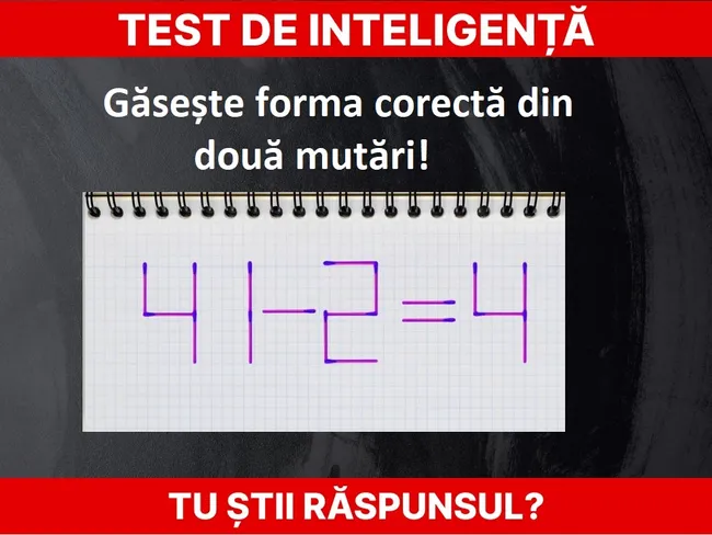 Citește și: Test de inteligență. Avem ecuația 9 + 3 x 2 =2 din bețe de chibrit. Mută unul și află forma corectă