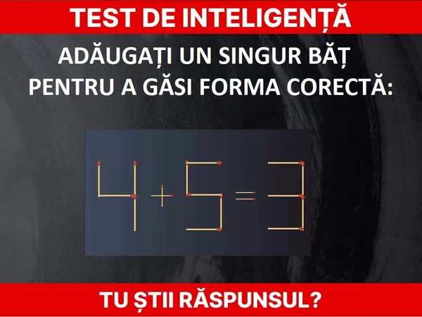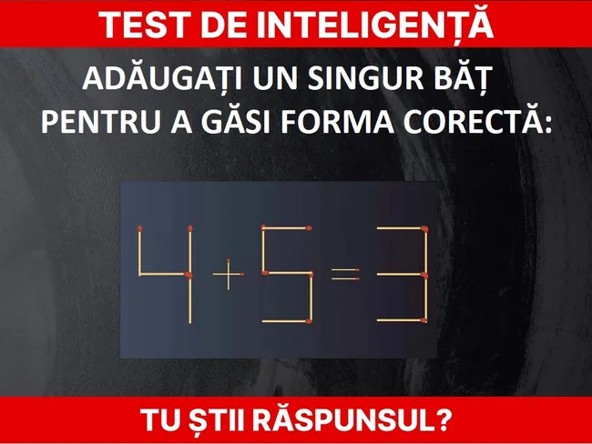 Citește și: Test de inteligență. Avem ecuația 8-8=2 din bețe de chibrit. Soate unul și găsește forma corectă