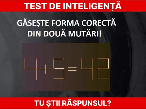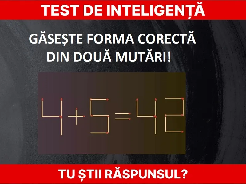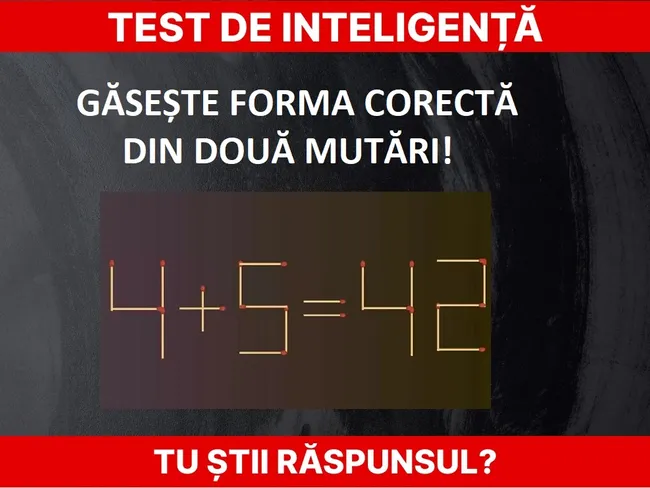 Citește și: Test de inteligență. Avem ecuația: 7+1=9 din bețe de chibrit. Găsește forma corectă din două mutări