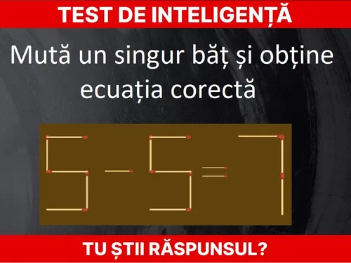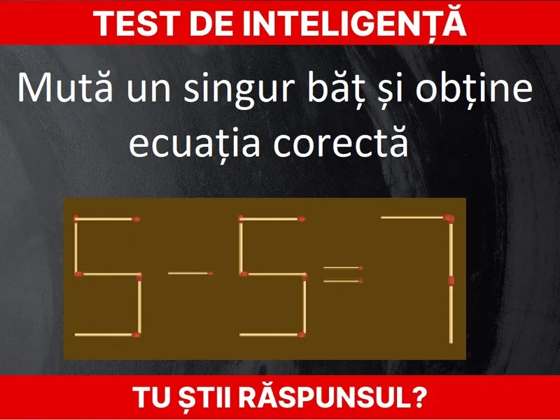 Avem ecuația 5-5=7. Este greșită. Însă dacă mutăm un singur băț de chibrit putem afla forma corectă.