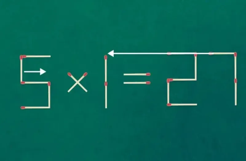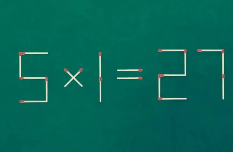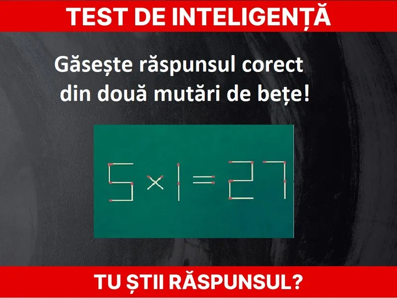 Ecuația matematică incorectă este: 5X1=27 și este compusă din 19 bețe de chibrit. Tot ce trebuie să faceți acum este să mutați două bețe de chibrit din pozițiile lor pentru a obține exercițiul corect.