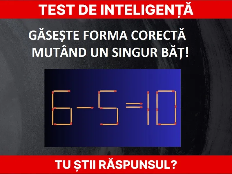 Ecuația 6-5=10 este greșită. Însă tocmai aici este testul. Trebuie să găsești forma corectă în doar 15 secunde, mutând doar un băț.