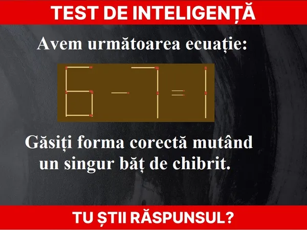 Citește și: Test de inteligență. Avem ecuația: ”1+3=6” din bețe de chibrit. fă o mutare și află soluția corectă