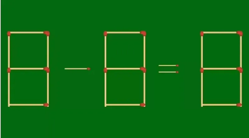 Avem ecuația: 8-8=8 din bețe de chibrit la fel cum este prezentată în imaginea de mai sus. Este greșită dar dacă scoatem un singur băț, găsim forma corectă.
