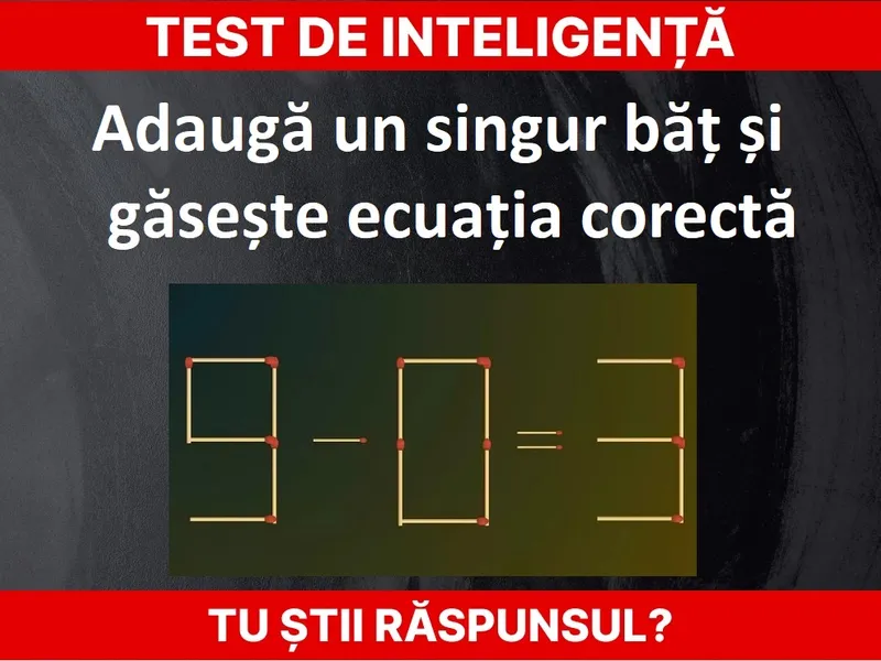 Citește și: Test de inteligență. Avem ecuația 9 + 3 x 2 =2 din bețe de chibrit. Mută unul și află forma corectă