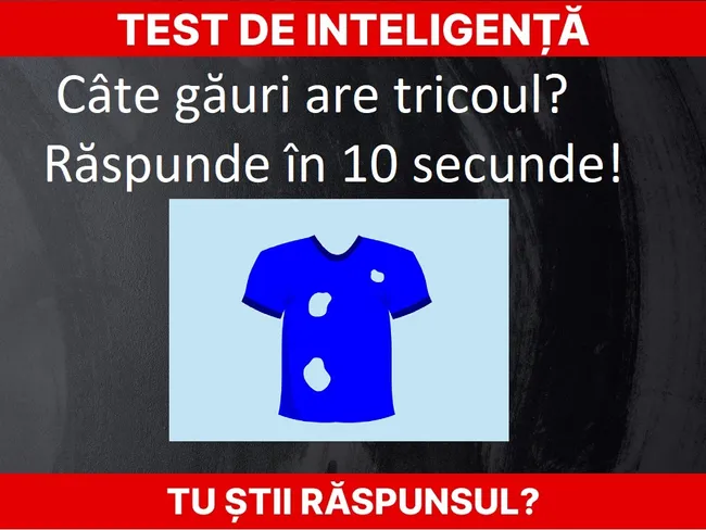 Vă propunem un test de inteligență puțin mai diferit. Numără cu atenție găurile dintr-un tricou. Atenție, este nevoie de concentrare maximă. Doar 10% dintre cei care au încercat au dat răspunsul corect din prima.
