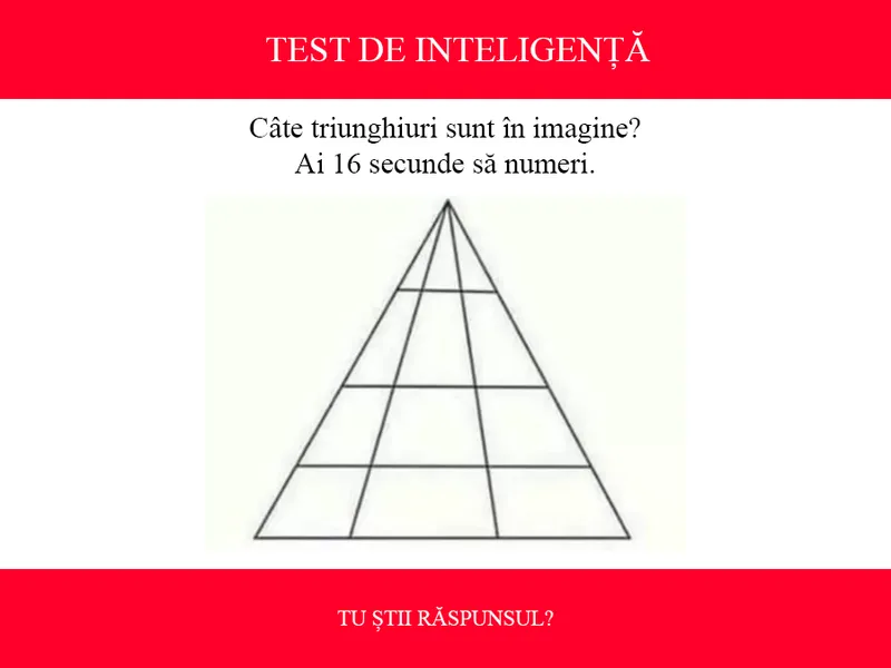 TEST DE INTELIGENȚĂ Câte triunghiuri sunt în imagine? Ai 16 secunde pentru a număra