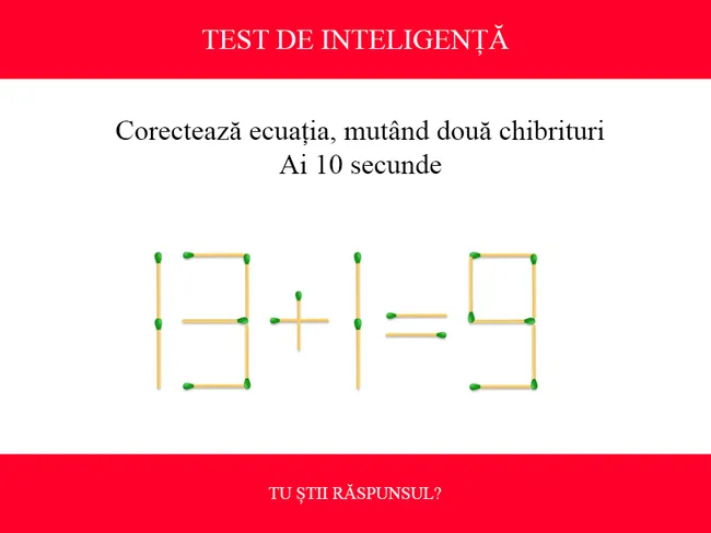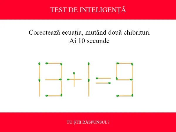 Se dă ecuația greșită 13+1=9. Numerele sunt formate din bețe de chibrit. Provocarea este să muți doar două bețe de chibrit pentru a corecta ecuația. Ai doar 10 secunde la dispoziție.