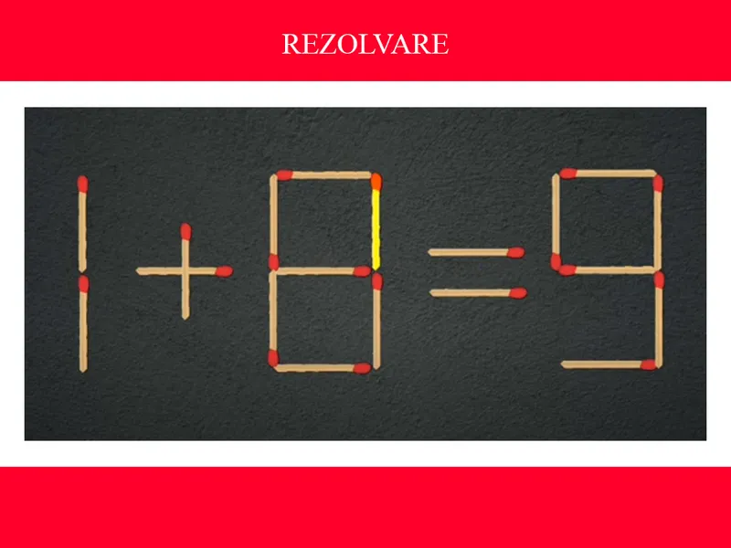 Dacă nu ai reușit, îți arătăm noi rezolvarea, în imaginea de mai jos. Dacă ai reușit să rezolvi, te felicităm! Pentru a rezolva, tot ce trebuie să faci este să iei un chibrit de la cifra 8, astfel încât să o transformi în 9, iar bățul să-l muți la cifra 6, pentru a forma cifra 8. Astfel, obții ecuația corectă: 1+8=9.