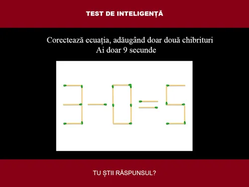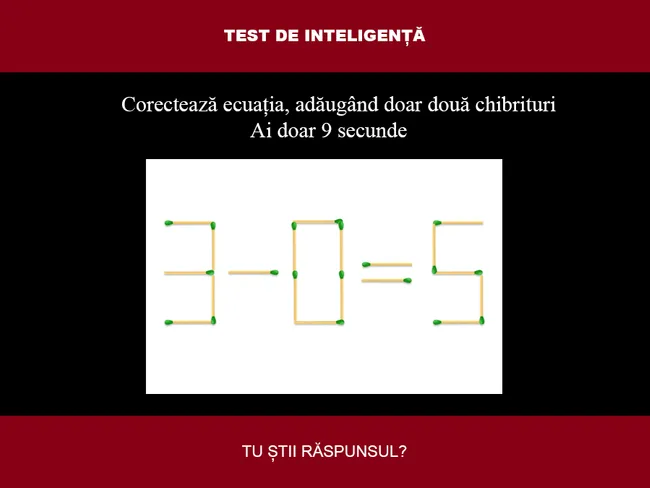 TEST DE INTELIGENȚĂ Corectează ecuația 3-0=5, adăugând două chibrituri. Rezolvă în 9 secunde