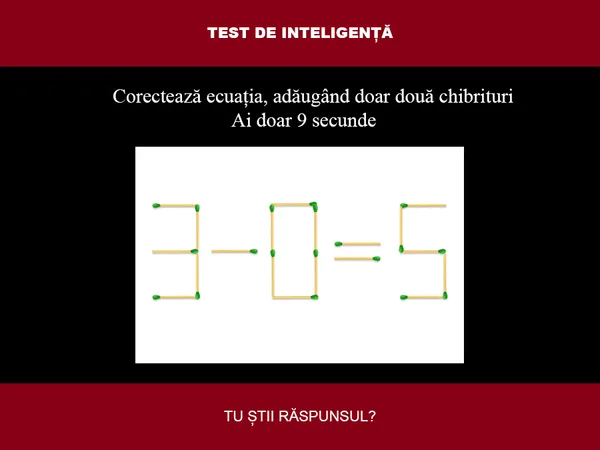 Se dă ecuația greșită 3-0=5. Cifrele sunt formate din bețe de chibrit. Provocarea este să adaugi doar două bețe de chibrit pentru a corecta ecuația. Ai doar 9 secunde la dispoziție.