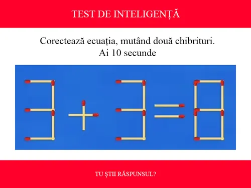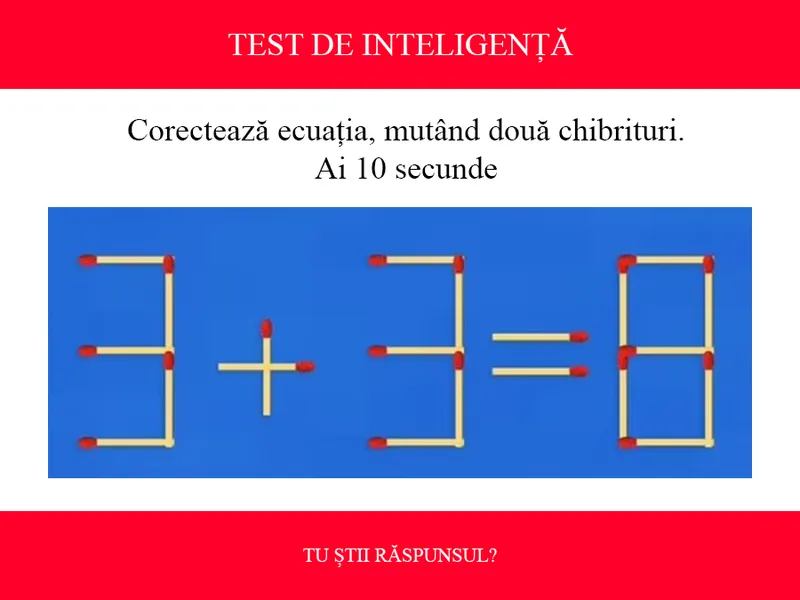 Citește și: TEST DE INTELIGENȚĂ Corectează ecuația 3-0=5, adăugând două chibrituri. Rezolvă în 9 secunde