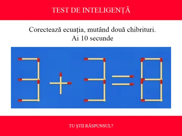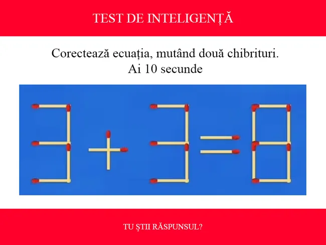 TEST DE INTELIGENȚĂ Corectează ecuația 3+3=8, mutând două chibrituri. Ai 10 secunde. Doar 2% reușesc. Dacă găsești soluția în timpul acordat, înseamnă că ai un IQ ridicat.