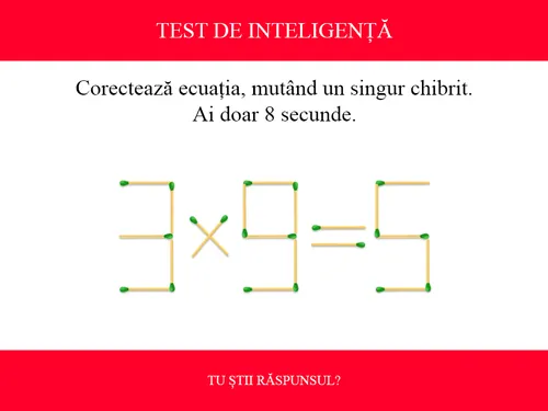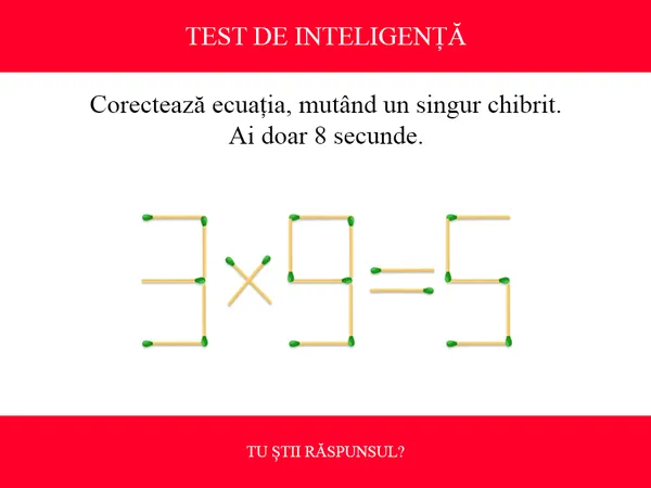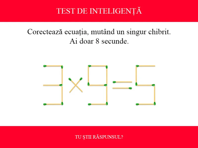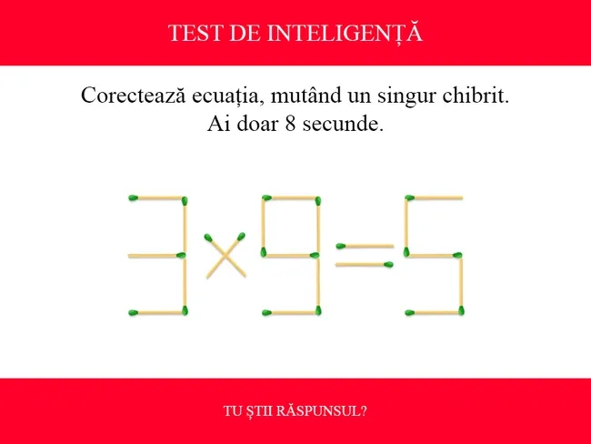 TEST DE INTELIGENȚĂ Corectează ecuația 3x9=5, mutând un singur chibrit. Ai doar 8 secunde