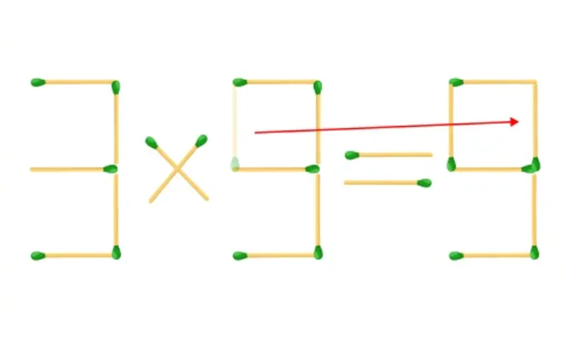 Se dă ecuația greșită 3x9=5. Cifrele sunt formate din bețe de chibrit. Provocarea este să muți doar un băț de chibrit pentru a corecta ecuația.