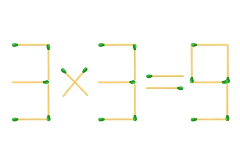 Pentru a rezolva, tot ce trebuie să faci este să iei un chibrit de la cifra 9, astfel încât să o transformi în cifra 3, iar bățul să-l muți la cifra 5, astfel încât să o transformi în cifra 9. Vei obține ecuația corectă 3x3=9.