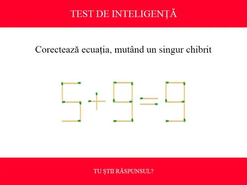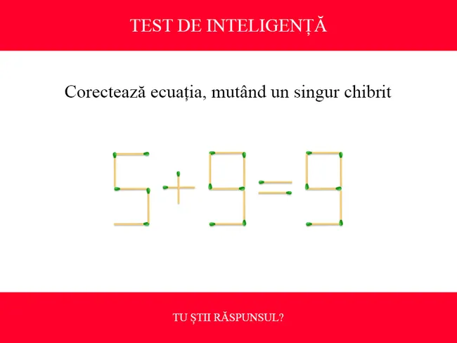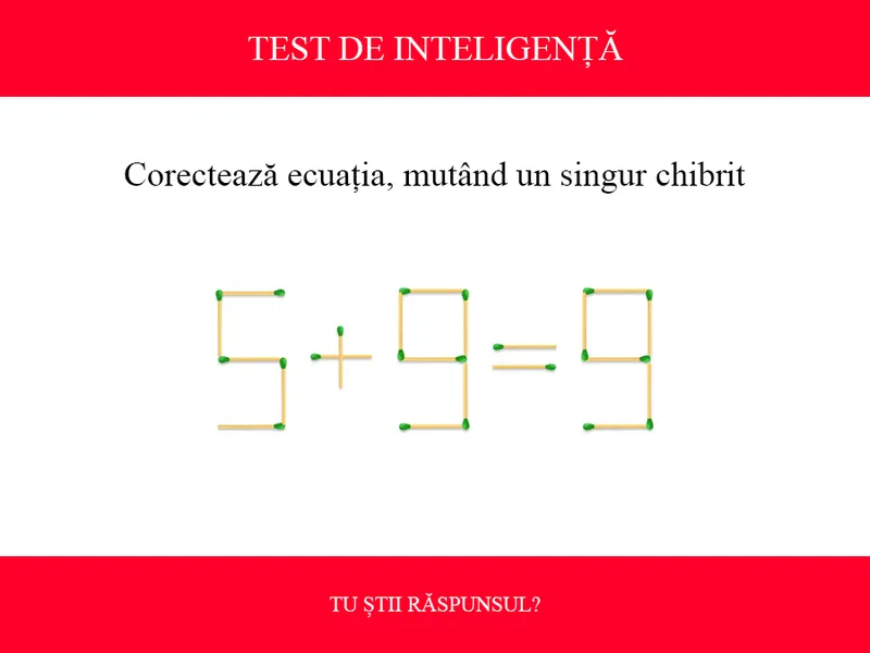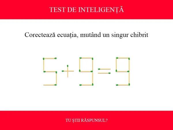 TEST DE INTELIGENȚĂ Corectează ecuația 5+9=9, mutând doar un chibrit. Ai 10 secunde