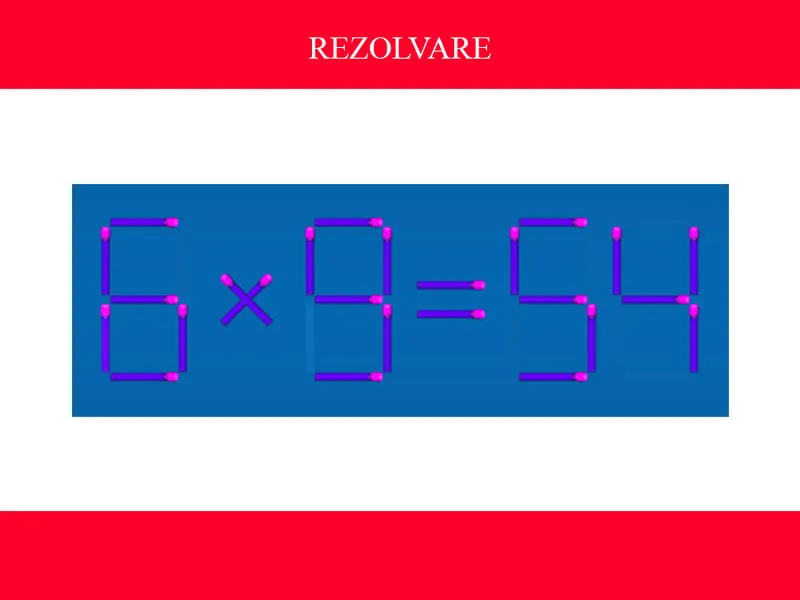 Pentru a rezolva, tot ce trebuie să faci este să iei un chibrit de la cifra 8, astfel încât să o transformi în 9, iar bățul să-l muți la 5, astfel încât să formezi cifra 6. Vei obține ecuația corectă: 6x9=54.