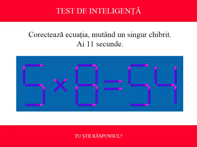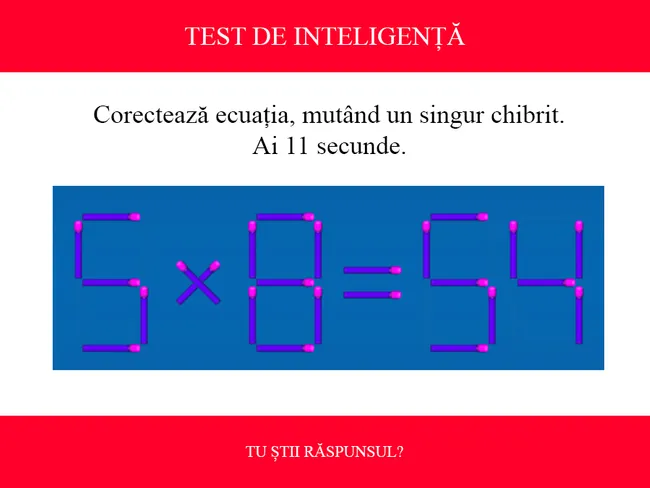 Se dă ecuația greșită 5x8=54. Numerele sunt formate din bețe de chibrit. Provocarea este să muți doar un băț de chibrit pentru a corecta ecuația. Dacă rezolvi în 11 secunde, înseamnă că ai un IQ ridicat.