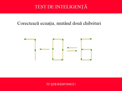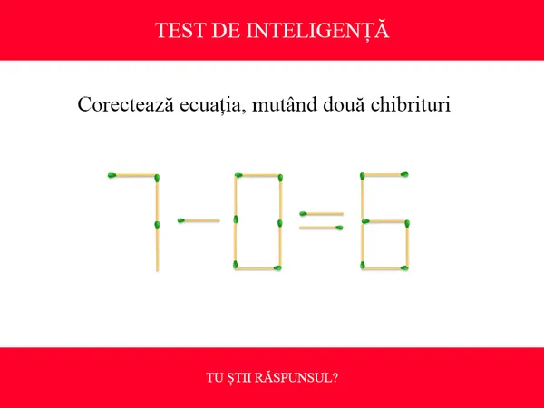 TEST DE INTELIGENȚĂ Corectează ecuația 7-0=6, mutând doar două chibrituri. Ai 11 secunde