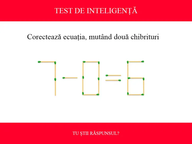 Se dă ecuația greșită 7-0=6. Cifrele sunt formate din bețe de chibrit. Provocarea este să muți doar două bețe de chibrit pentru a corecta ecuația. Ai doar 11 secunde la dispoziție.